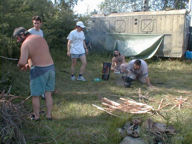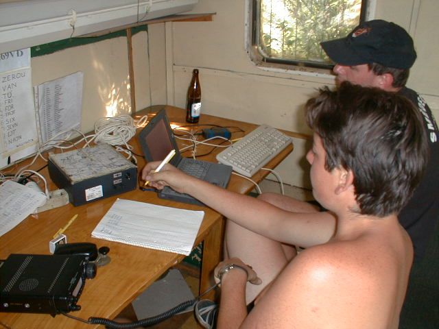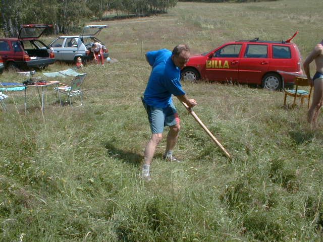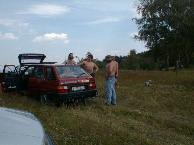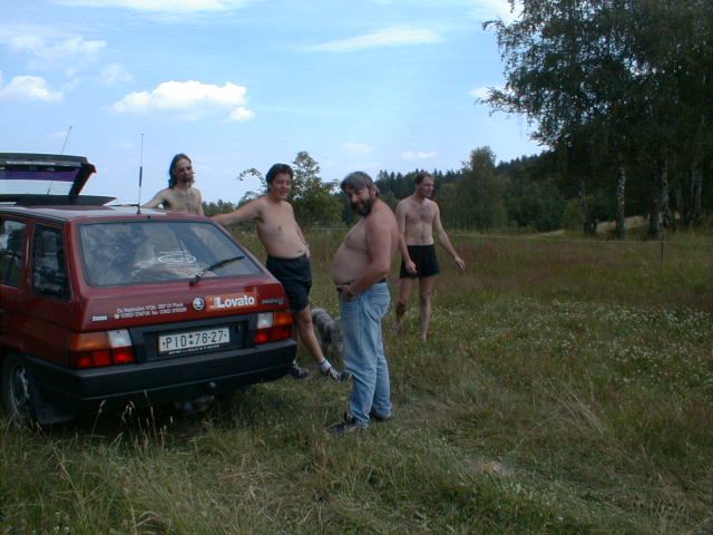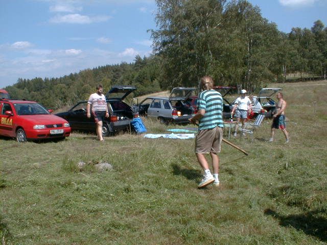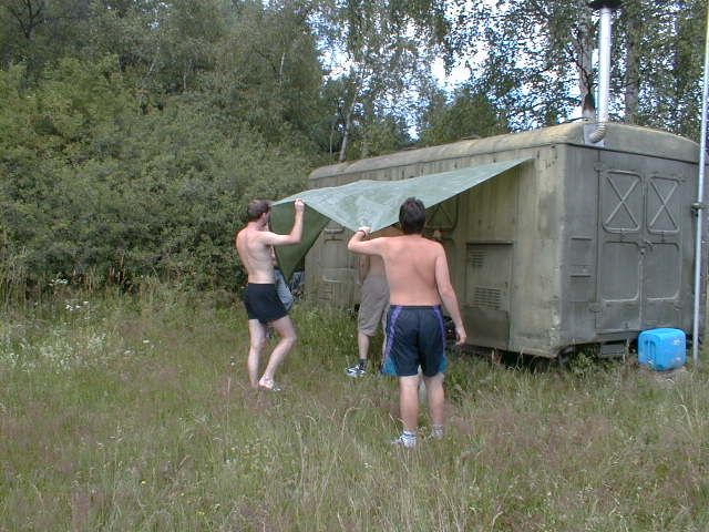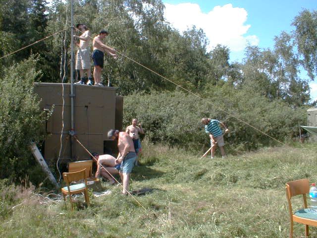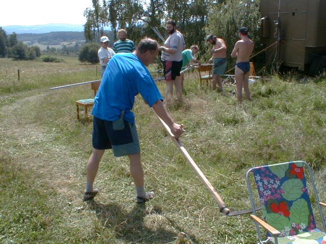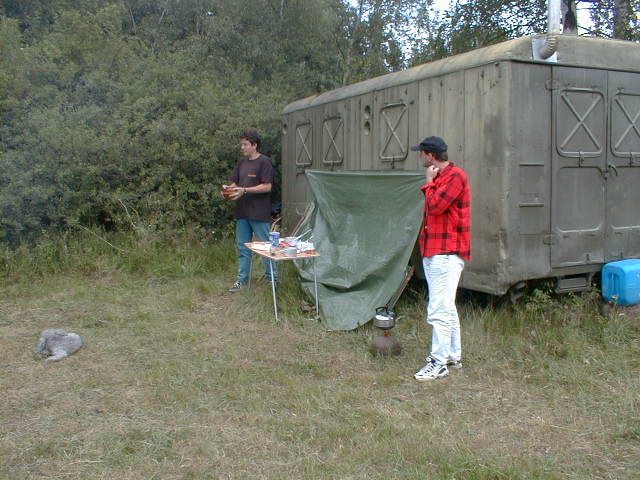 Do vysílací buňky se Láďa musí prosekat Stožár se musí dobře ukotvit Stanice ze které se jel závod "YAESU FT 100" výkon 50 W Auta se musí srovnat do lajny Bude svačina, Pavel připravuje gril na dobře naložené maso na medu