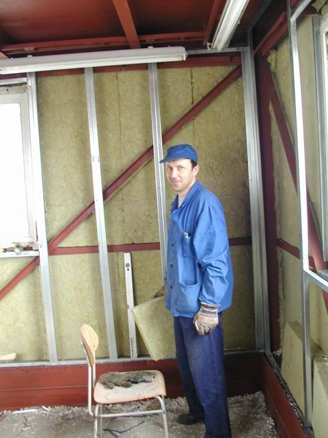příprava antény Naše základna v celé své kráse Toník montuje lišty pro přichycení sádrokartonu Milan izoluje stěny aby nám tam bylo teplo