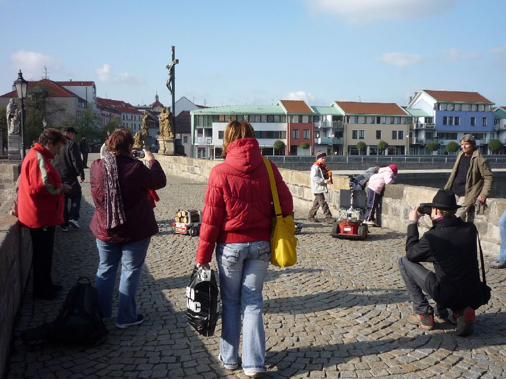 Pája vede celou kolonu na pózování na starém mostě Vagónky se pořád couraj